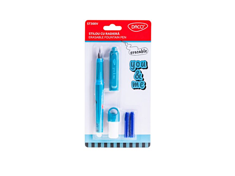 Corpul este realizat din plastic rezistent, ușor și durabil, iar gripul cauciucat oferă confort și stabilitate în timpul scrierii. Penița F din iridiu asigură o scriere fină, precisă și cursivă, potrivită pentru scrisul de mână clar și controlat. Stiloul este echipat cu radieră integrată în capac, care permite ștergerea cernelii termosensibile prin frecare, facilitând corecturile rapide.