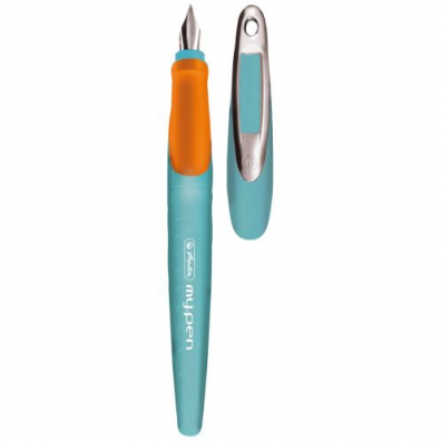 Stilou my.pen, penita M din otel inoxidabil, corp din material plastic, grip ergonomic anti-alunecare, potrivit pentru dreptaci, clips metalic flexibil, alimentare cu patroane de cerneala, culoare turcoaz/portocaliu, vrac (1 patron de cerneala inclus).